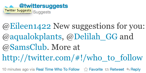 As Twitter describes it, "@twittersuggests is an experimental feature that helps you find interesting new accounts to follow by tweeting Who To Follow suggestions, personalized just for you! This feature was created by Twitter, and it looks like a normal Twitter account – it will Tweet recommendations which you can reply to, retweet or mark as favorites."